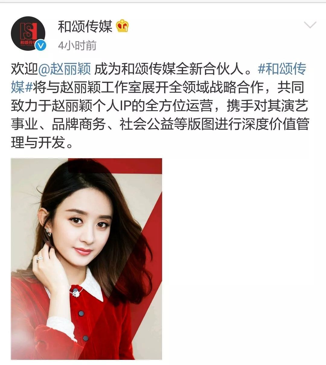 终于,和颂传媒的官方微博发文,宣布赵丽颖即将以合伙人的身份加入和颂传媒,和颂传媒将在演艺事业、品牌商务和社会公益等领域与赵丽颖展开深度合作。