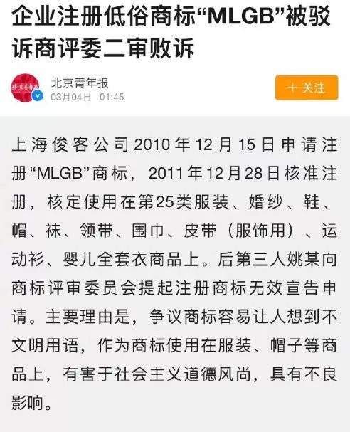 近日,李晨与潘玮柏的潮牌MLGB被宣告商标无效,原因是北京最高院认为该商标以擦边球的行为迎合三俗行为,容易让人联想到不文明用语,有害社会主义道德风尚,有不良影响。