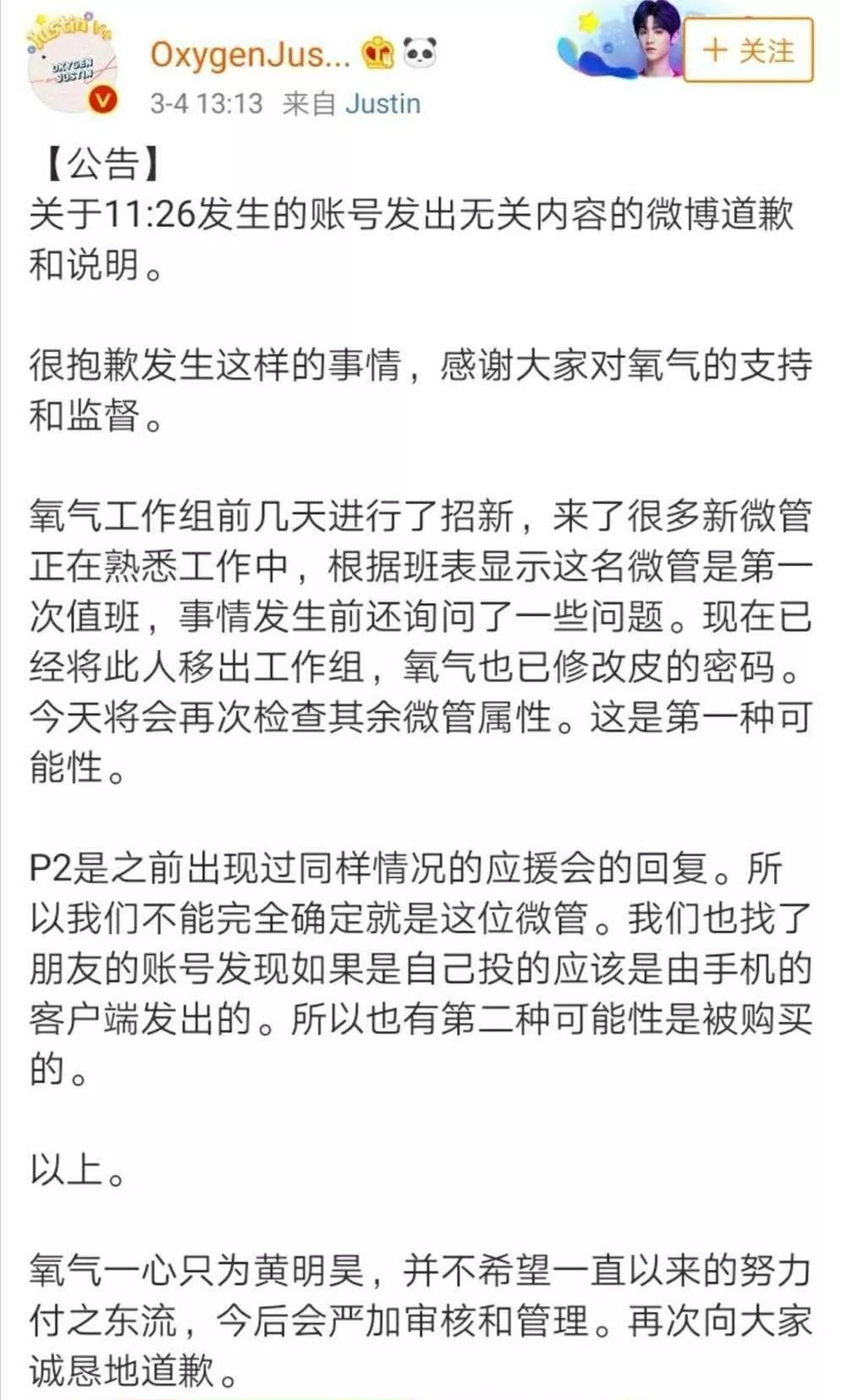 随后,黄明昊的资源博给出声明,表示是新微管出了问题,已经整顿,今后会严加审核,对于此次事件向大家致歉。