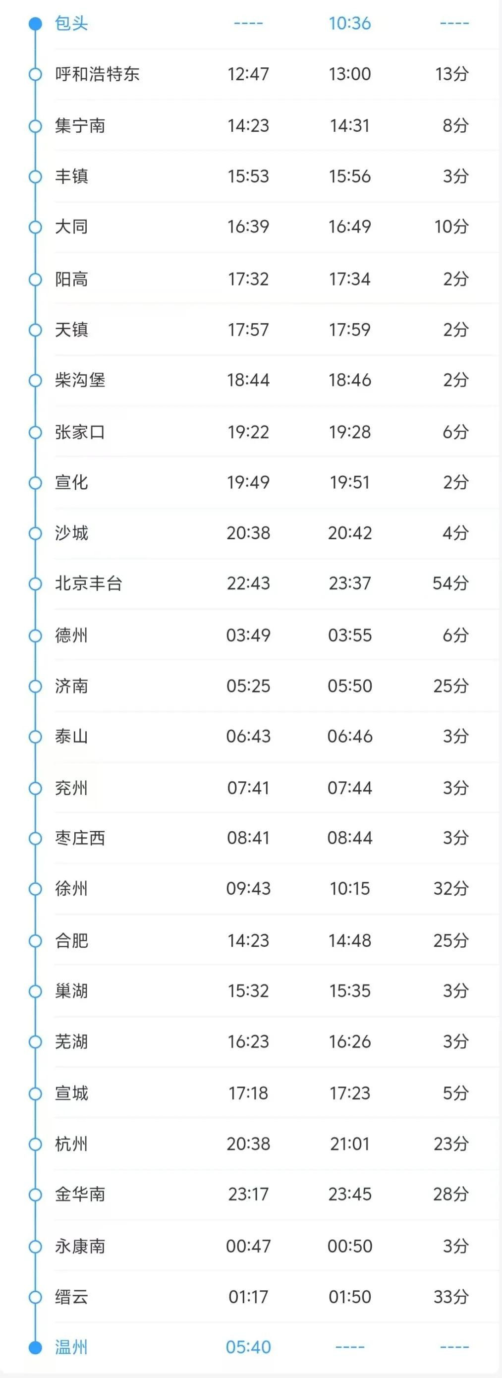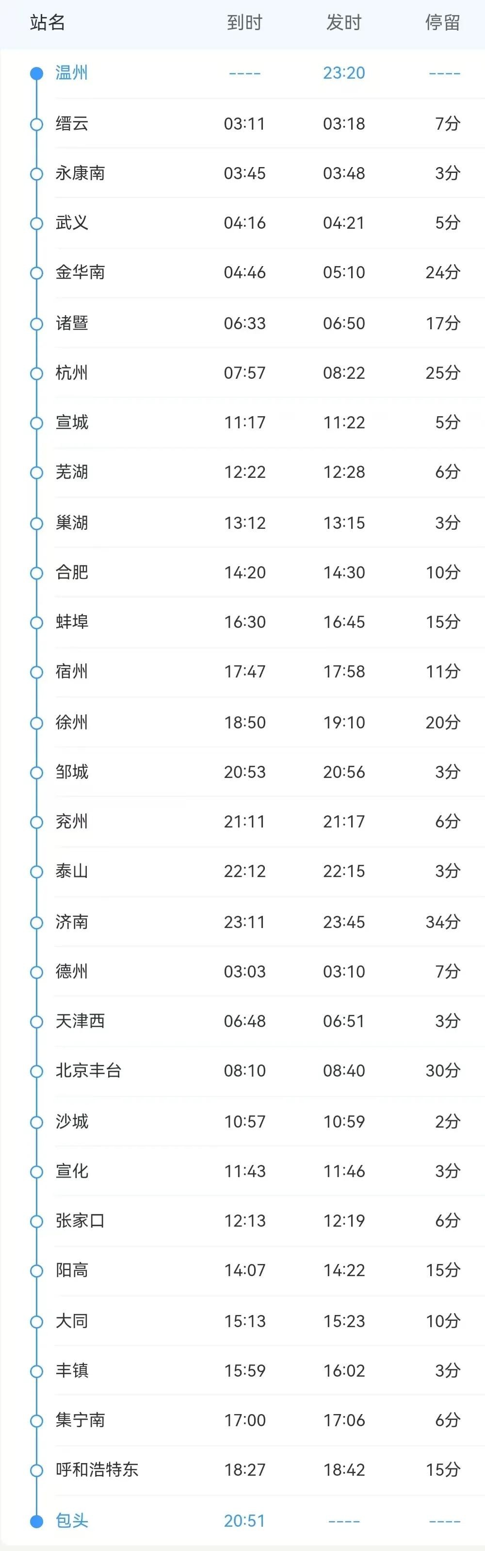 K1278/5次列车运行于包头至温州间,单程运行里程2760公里,运行时间43小时04分,途经大同、张家口、北京丰台、济南、徐州、合肥、杭州、温州等27个车站。