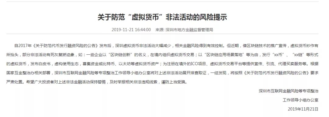 就在发文的昨日,也就是2019年11月21日,深圳市地方金融监管局出具了“关于防范虚拟货币非法活动的风险提示”中提出来:一些企业以“区块链创新”的名义,在境内组织虚拟货币交易;以“区块链应用场景落地”等为由,发行“xx币”,“xx链”等形式的虚拟货币,发布白皮书,虚构使用生态,募集资金或比特币、以太坊等虚拟货币资产;为注册在境外的ICO项目、虚拟货币交易平台等提供宣传、引流、代理买卖服务等。根据国家互金整治办相关部署,深圳市互联网金融风险等专项整治工作领导小组办公室将对上述非法活动展开排查取证,一经发现,将按照《关于防范代币发行融资风险的公告》要求严肃处置。希望广大投资者对上述非法金融活动保持警惕,及时举报相关非法违规线索,谨防上当受骗。