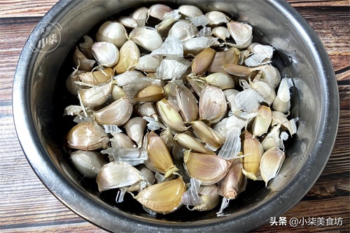 2、剥蒜皮是有技巧的,用手挤破皮法,还有切掉一头,今天我用浸泡法,把蒜剥成蒜瓣,放进清水里浸泡30分钟,泡至蒜皮变软,用手旋转皮就去掉了。