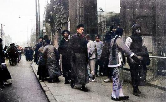 10、上海南京路上的行人。男子穿着长袍马褂