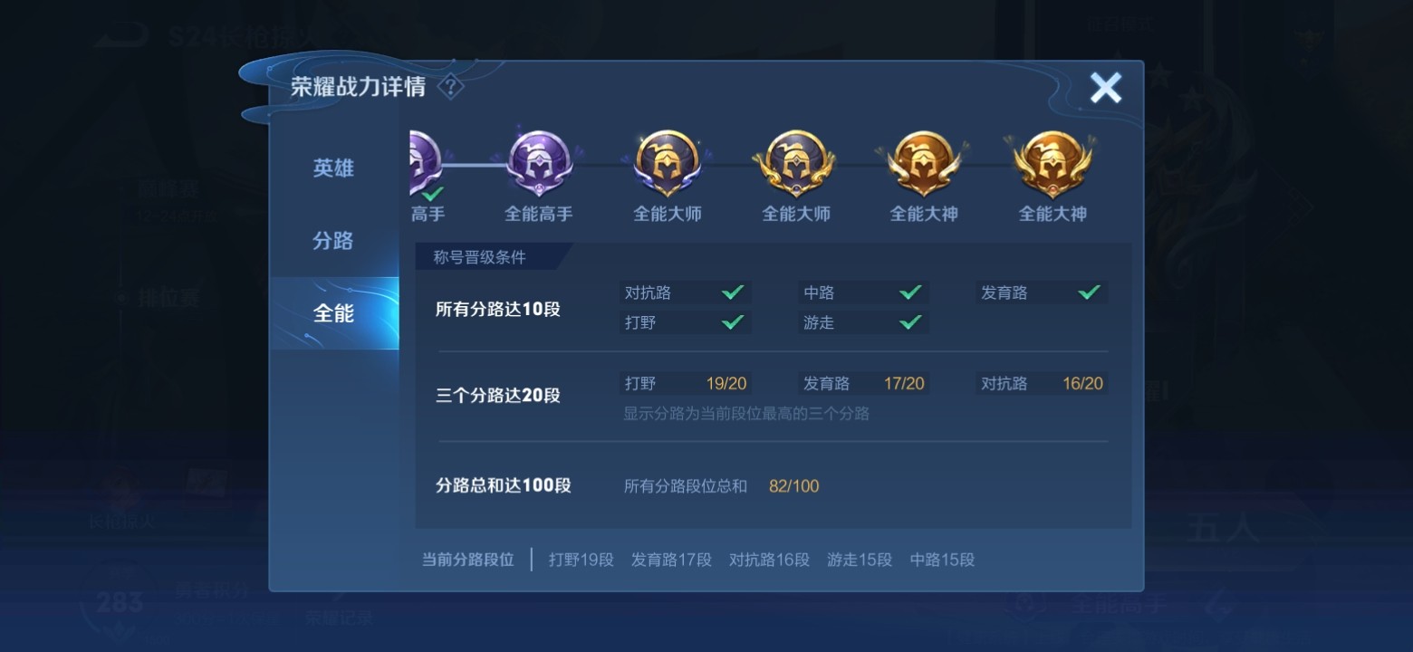 全能高手二段,需要所有分路10段,三个分路20段,分路总和100段