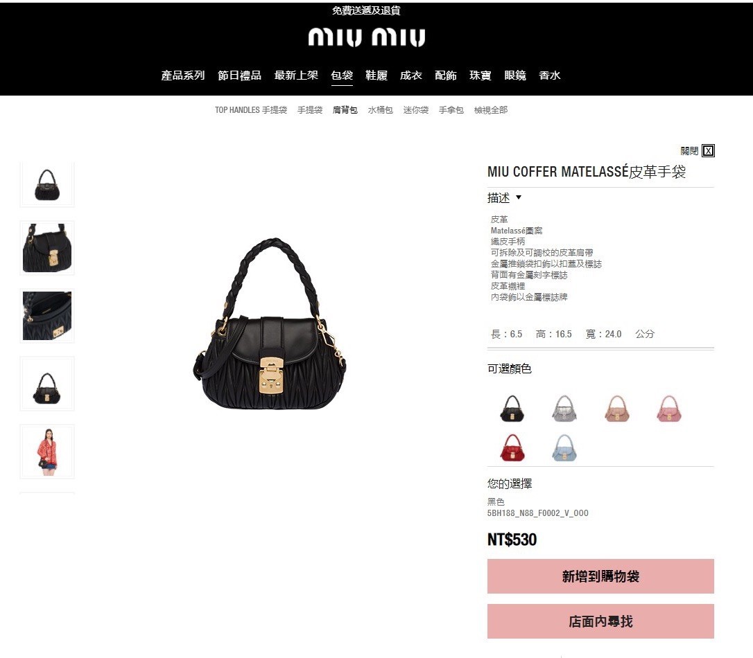▲原价台币52,000元MIU MIU可芙包,瞬间变成530元。(图/翻摄自官网)