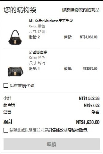 精品品牌MIU MIU于今(11日)下午1点多左右官方网站出现「标错价」情形,爆款包包款式通通变成台币千元,甚至是五百多元,现在约莫过了两小时,官网商品页面紧急关闭,不过有民众手脚超快,更截到了订购成功的画面,目前MIU MIU表示:「已经向米兰总部报告,后续会由总部统一处理。」网友戏称:「1111最强优惠就是你了。」、「可恶,来不及了。」