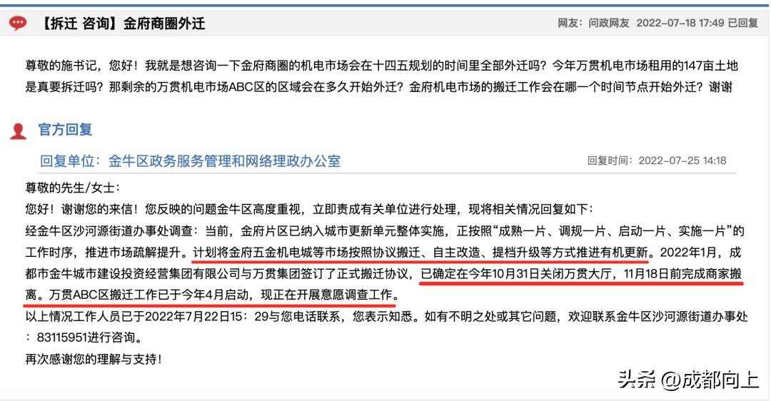 也许是看到万贯机电城都安排了搬迁,今年7月,又有人询问金府商圈是否全部外迁?官方给到的回复是:计划将金府五金机电城等市场按照协议搬迁、自主改造、提档升级等方式推进有机更新。