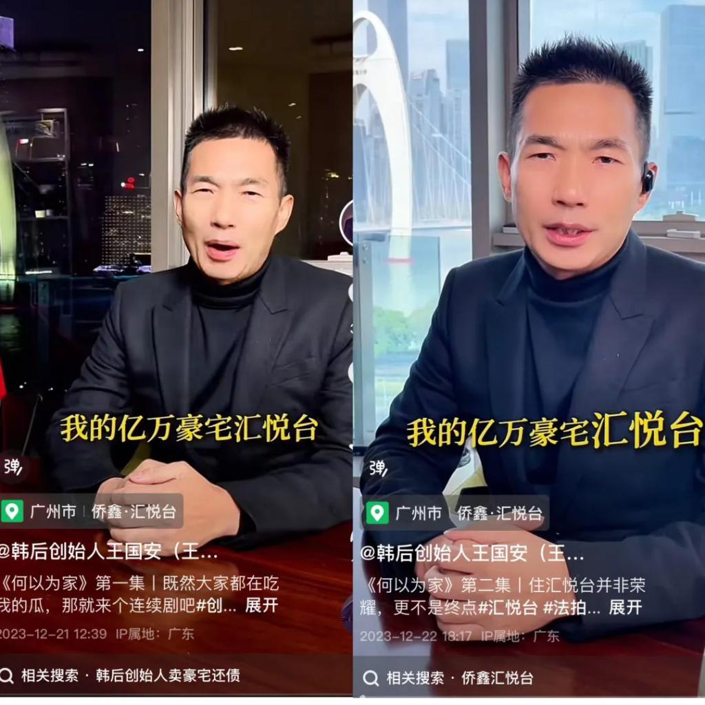 12 月 21 日开始,韩后创始人、现年 46 岁的王国安,定期在个人抖音账号更新 " 何以为家 " 系列,主动讲述了自己豪宅被拍卖,欠下 1500 万元的来龙去脉。" 我的亿万豪宅汇悦台被拍卖了。" 目前更新的四条视频,王国安均以同样的方式开头,末了,也都不忘来一句 " 预知后事如何,点赞关注 "。