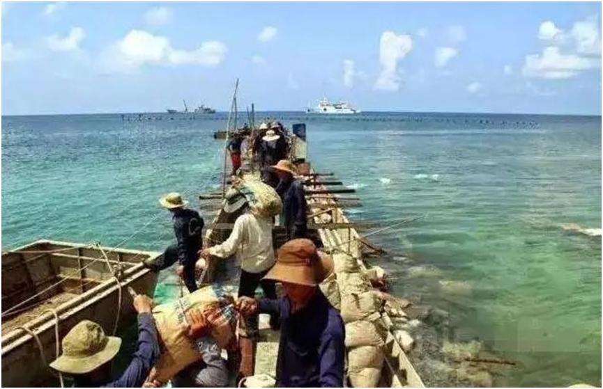 以前,因为缺少设备,越南方面使用的一直都是围堰填岛技术。也就是先用沙袋、水泥块等设备在岛礁周围圈地,然后通过人工方式一点一点的向圈里填砂,将海水置换出来。这种填海造陆的方式不仅效率差,工程效果也难以保证。一场暴风雨产生的巨浪就足以摧毁这些围堰,然后卷走没有根基固定的填砂。如今得益于西方的援助,越南才得以在南海进行大规模填海造陆,在短短的一年多时间里就填海造陆超过2平方公里,超过过去十年的总和。