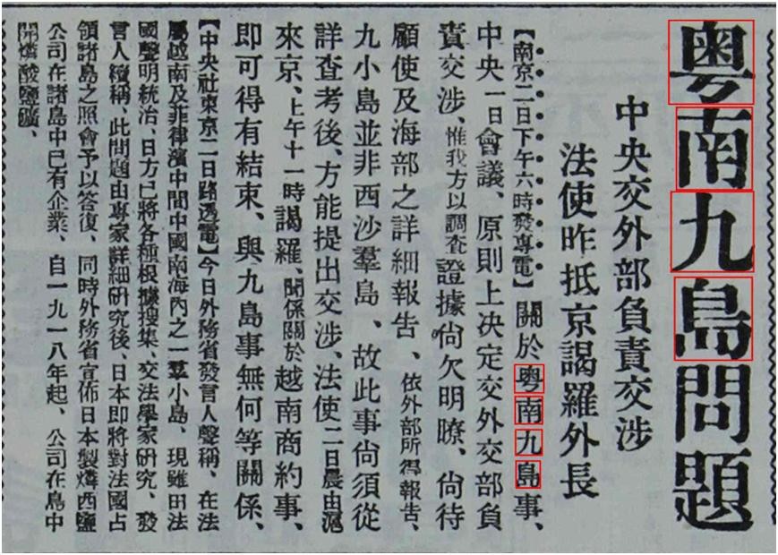 对此,中国政府对法国进行了积极地外交交涉。7月26日,中国外交部专电向法国政府提出严重抗议。郑重指出,法占九小岛“仅有我渔人居留岛上,在国际间确认为中国领土”。8月4日,中国外交部照会法国驻华使馆声明,“中国政府在未经确定查明以前,对于法国政府占领之宣言,保留其权利。”不久,中国政府即向法国政府提出正式抗议,谴责法国侵占我南沙岛礁的无理行为。