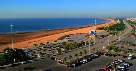 坡缓水洁,沙质细柔,夏季中午海水水温为25左右,是我国最优良的天然海水浴场之一,素有"北方第一海滩"之称。沙滩长10000米、宽60-180米,沙砾幼细,色泽金黄,面积广大,坡度平缓,又称万米金沙滩,这里是进行日光浴、沙滩排球等沙上运动的极佳之地。