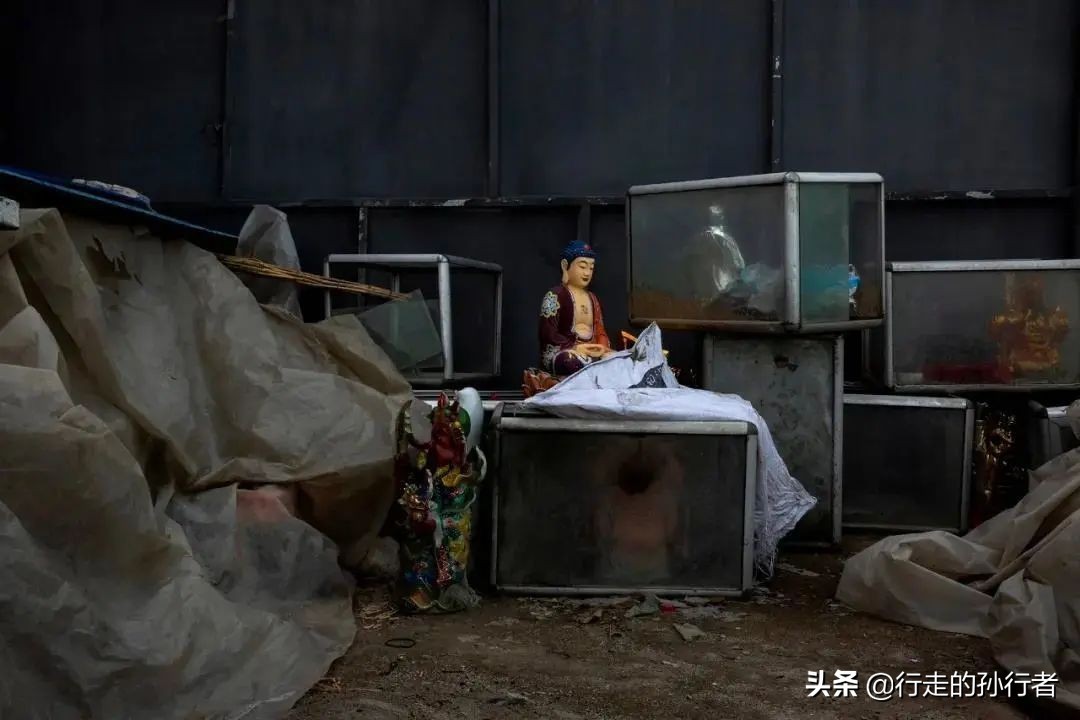 在庙宇后堆放的神像。