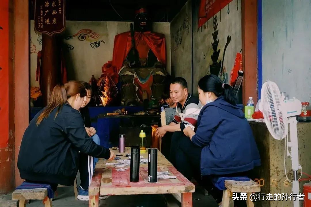 在财神殿玩牌的庙宇管理者。
