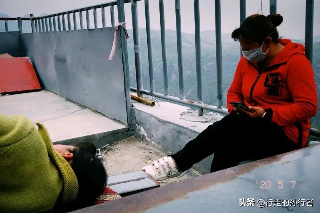 5月6日,一位村民正在劝说下山的游客进殿。