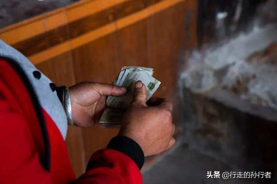 傍晚,一位看管庙宇的村民在数着从功德箱中拿出的钱。