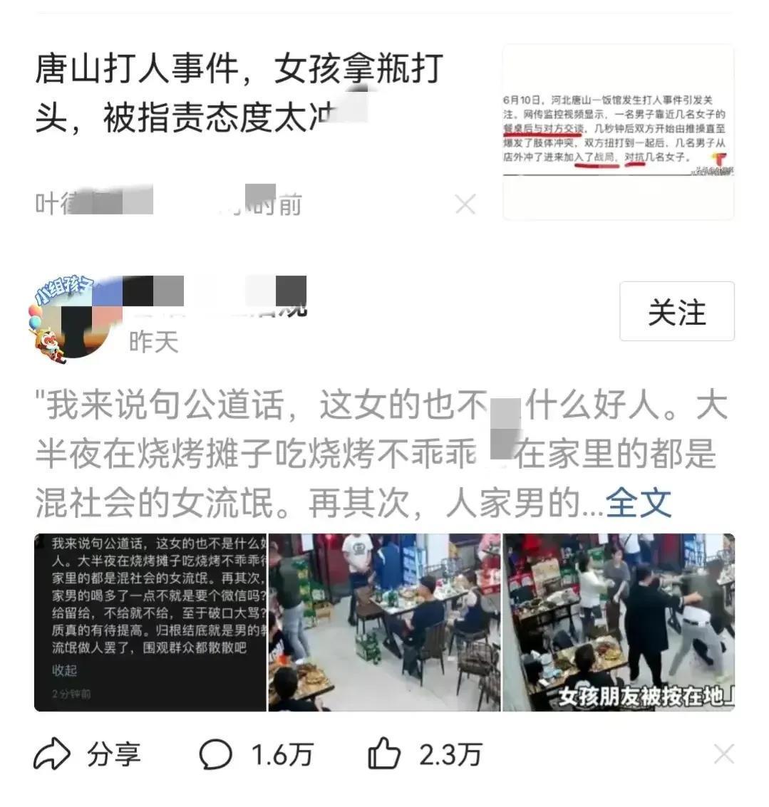 女人怎么了?谁说的女人就不能有享受正常的“夜生活”权力?谁说女性遭到挑衅就不能反抗?谁说的大半夜在外面吃个宵夜就不是好人了?同情被打者,谴责行凶者怎么就成了女权泛滥了,只要是个正常人,对这一事件都会愤怒,都会对受害人产生同情感。
