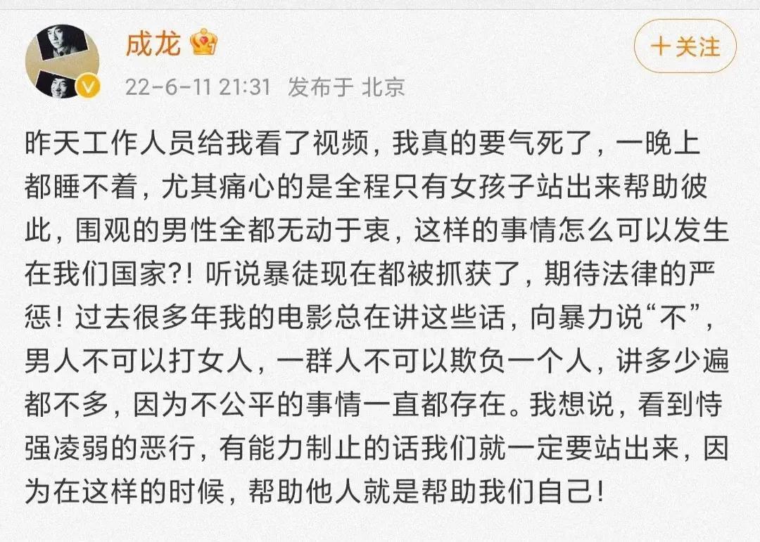 成龙大哥,是发声较晚的大腕,他说看了视频之后,气愤到一晚上睡不着,他很痛心全程只有女孩子站出来帮助彼此,围观的男性全都无动于衷,这样的事情怎么发生在我们这个国家……。