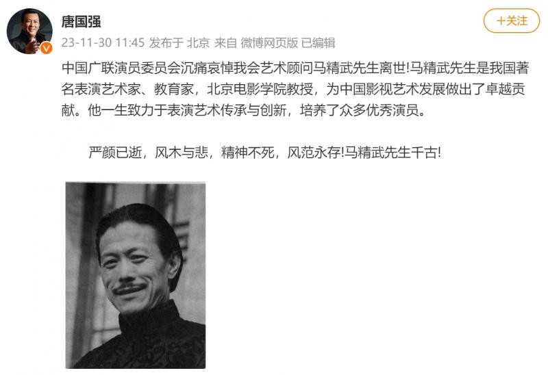 11月30日,北京电影学院表演系教授、国家一级演员、中国电影家协会会员马精武逝世,享年86岁。噩耗传出后,圈中好友纷纷发文哀悼。