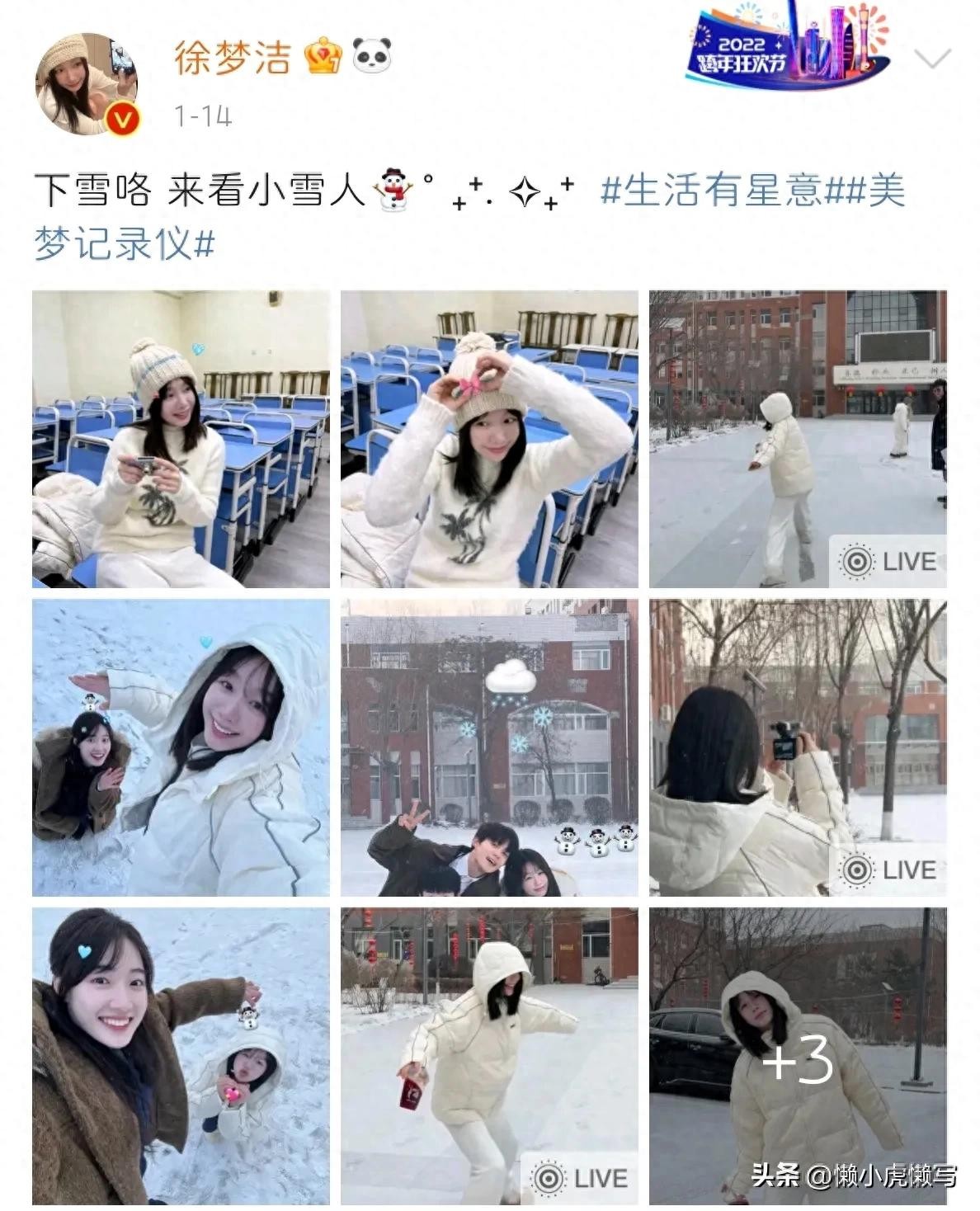 近日,徐梦洁发了一组玩雪的照片。