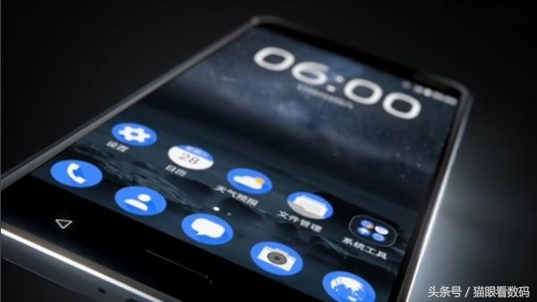 机身右上角有一个NOKIA Logo。该机运行Android7.0操作系统,并采用了诺基亚自己的UI界面,主屏非常简洁,上方是时间天气小部件,下方是2×5共10个应用图标。和大部分安卓系统一样,Nokia 6的系统也支持将不同的应用图标放置在一个文件夹当中。