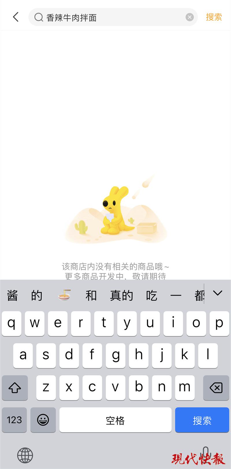 △ 记者在外卖平台 " 肥叔锅贴 " 南京一门店页面搜索牛肉拌面,显示没有该品种供应