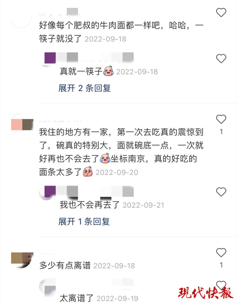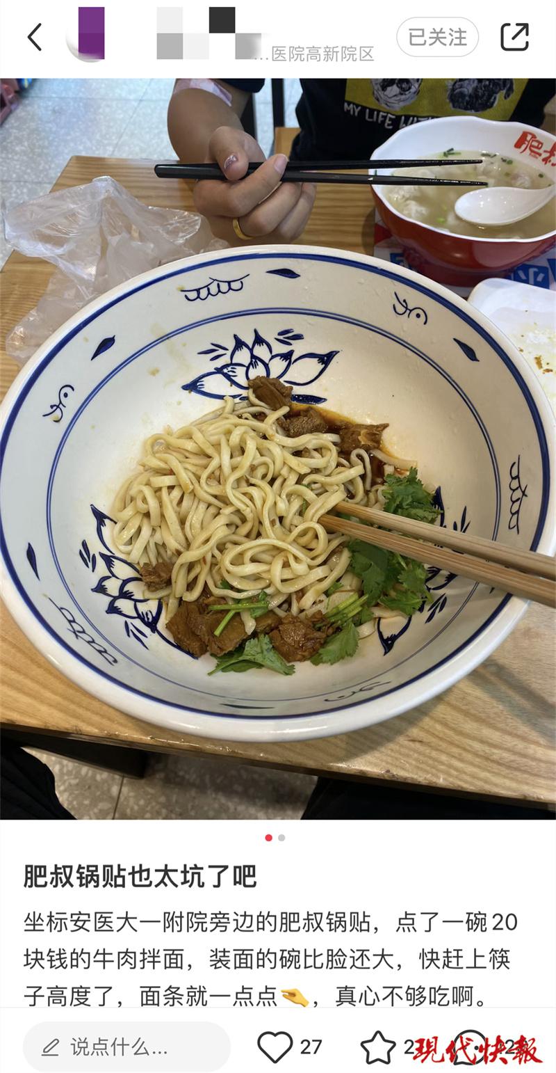 现代快报记者搜索发现," 肥叔锅贴 " 作为一家连锁餐饮,在南京有数十家门店。在某社交平台上,有博主在去年就发布过类似的照片,称 " 装面的碗比脸还大,面条就一点点,真心不够吃。" 而不少人在跟帖中反映有同感。