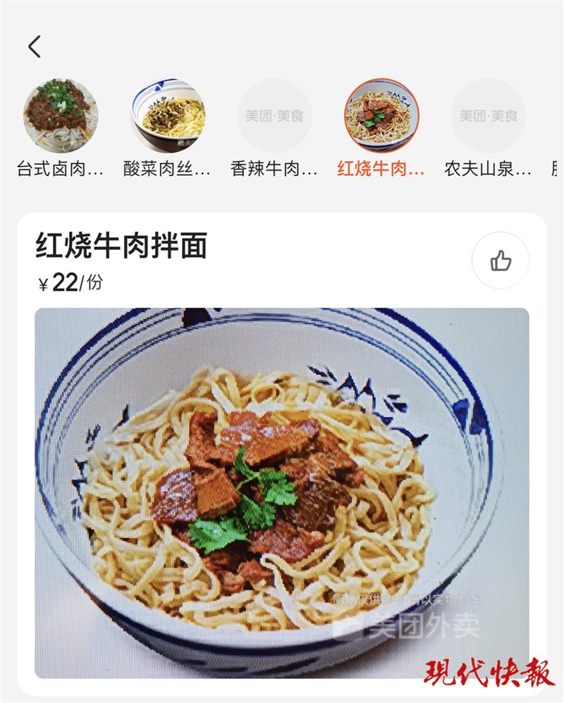20 日下午 1 点多钟,现代快报记者来到洪武北路红庙一家 " 肥叔锅贴 ",在店里的商品展示板上,显示香辣牛肉拌面价格是 22 元 / 份。不过记者要点拌面时,店员表示,这一款暂时下架了,但香辣牛肉汤面可以提供。他说拌面的酱汁暂时断货,其他品种照常售卖。