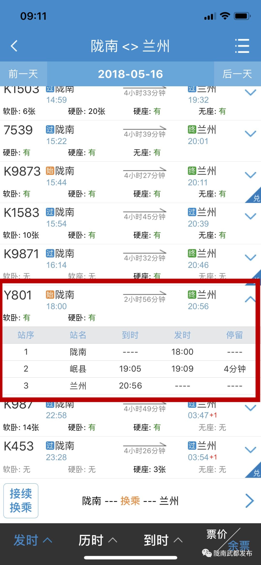 5月16日至5月31日每逢周三、四、五,6月1日至6月30日每逢周二、三加开兰州—陇南Y802次;5月16日至5月31日,每逢周三、四、五,6月1日至6月30日每逢周二加开陇南—兰州Y801次。