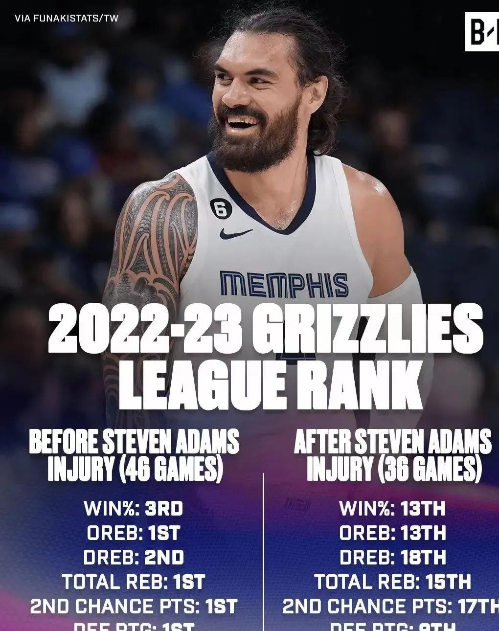 亚当斯的重要性不言而喻。他每场比赛都能通过掩护为球队创造12.6分,在全联盟中排名第二;他的前场篮板占比高达17.1%,在全联盟中名列第一。然而,自从他高挂免战牌之后,灰熊的篮板和防守等各项数据都从联盟榜首位置暴跌至中游,胜率也从第3位下滑到第13位。