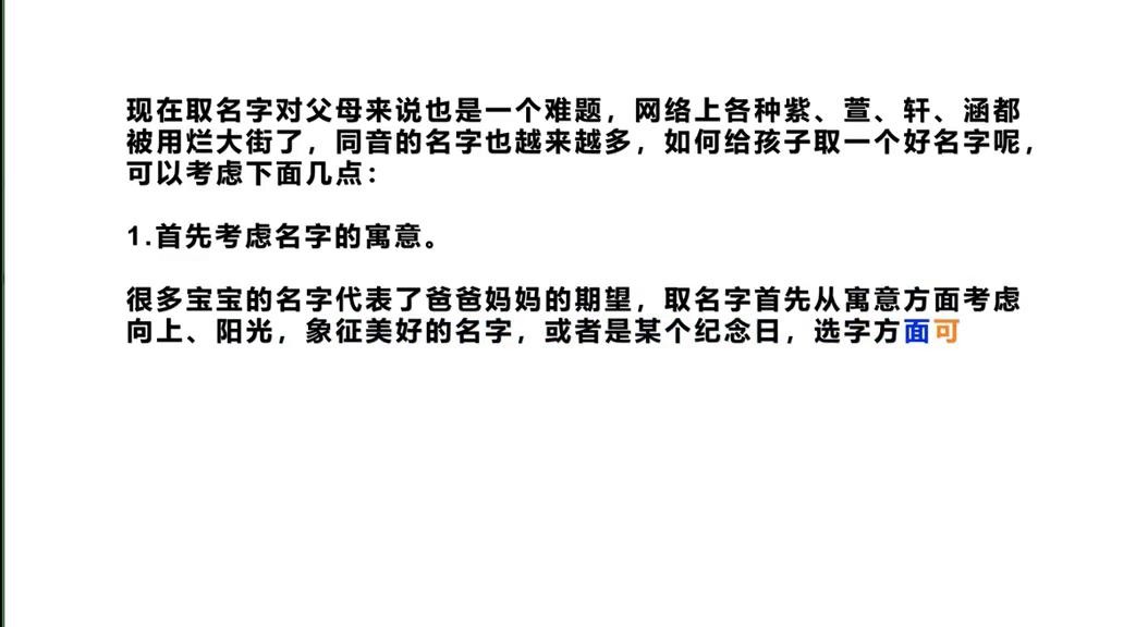 ·3.考虑民俗。很多还有辈分名字需要考虑,同时跟随周围主流。现在大部分名字是两个字、三个字,复姓的有四个字,不要取一些不随大流的名字。有的名字像外国的或者很长的名字,让人感觉怪怪的。当然如果父母双方都觉得很喜欢,也不必太在意别人的想法了。