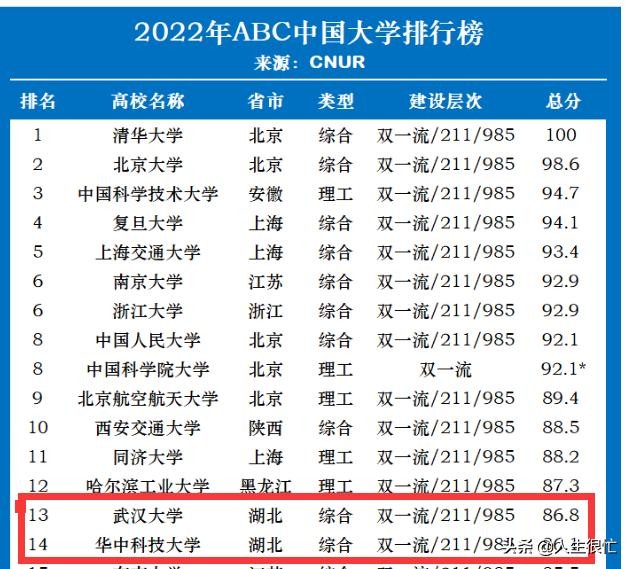 在2022年ABC(CNUR)中国大学排行榜中,武汉大学排名第13名,比华中科技大学高1名。