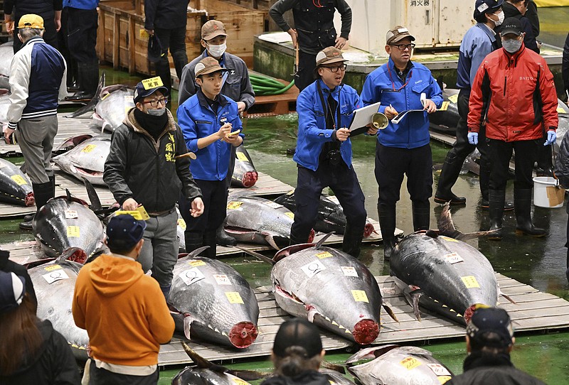 1月5日,日本东京丰洲市场,一条在青森县大间水域捕获的蓝鳍金枪鱼,以2亿700万日元(约合963万元人民币)的价格在本年度首次拍卖中成交。