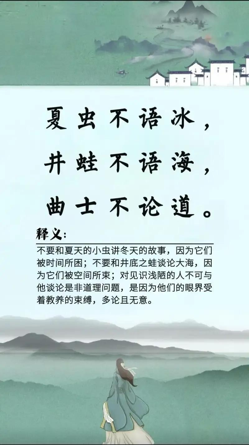 赏析:这里把见识短浅的人比作只能看到井口那么大天空的青蛙,和只经历过夏天、没见过冰的虫子,意思是和这些人没法谈论高深、广阔的事物,因为他们受自身见识和经历的局限,实际上是在贬低对方孤陋寡闻、眼界狭窄。