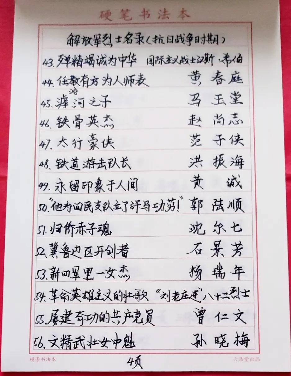 四、43至56的革命烈士有:汉斯.希伯、黄春庭、马玉堂、赵尚志、范子侠、洪振海、黄诚、郭陆顺、沈尔七、石景芳、杨瑞年、“刘老庄”八十二烈士、曾仁文、孙晓梅。