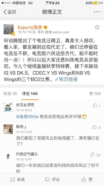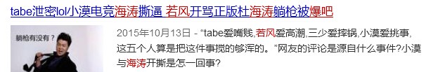 去年早些时候电竞海涛因为与LOL圈的若风吵架一事,成功拉到一大波撸er们的仇恨,然后百度杜海涛吧就惨遭爆吧。