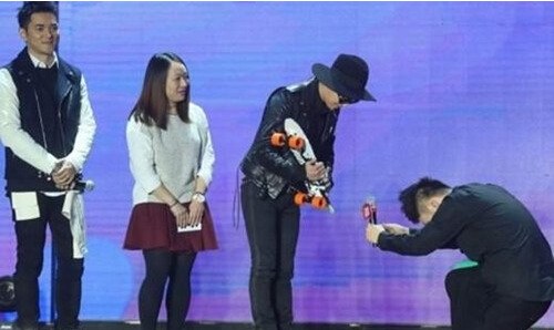 更早的时候,精确时间为2013年11月20日,韩国BigBang队长权志龙在北京出席某盛典,作为主持人的杜海涛看到偶像,不但激动得语无伦次,恳求与偶像合影,还单膝下跪。