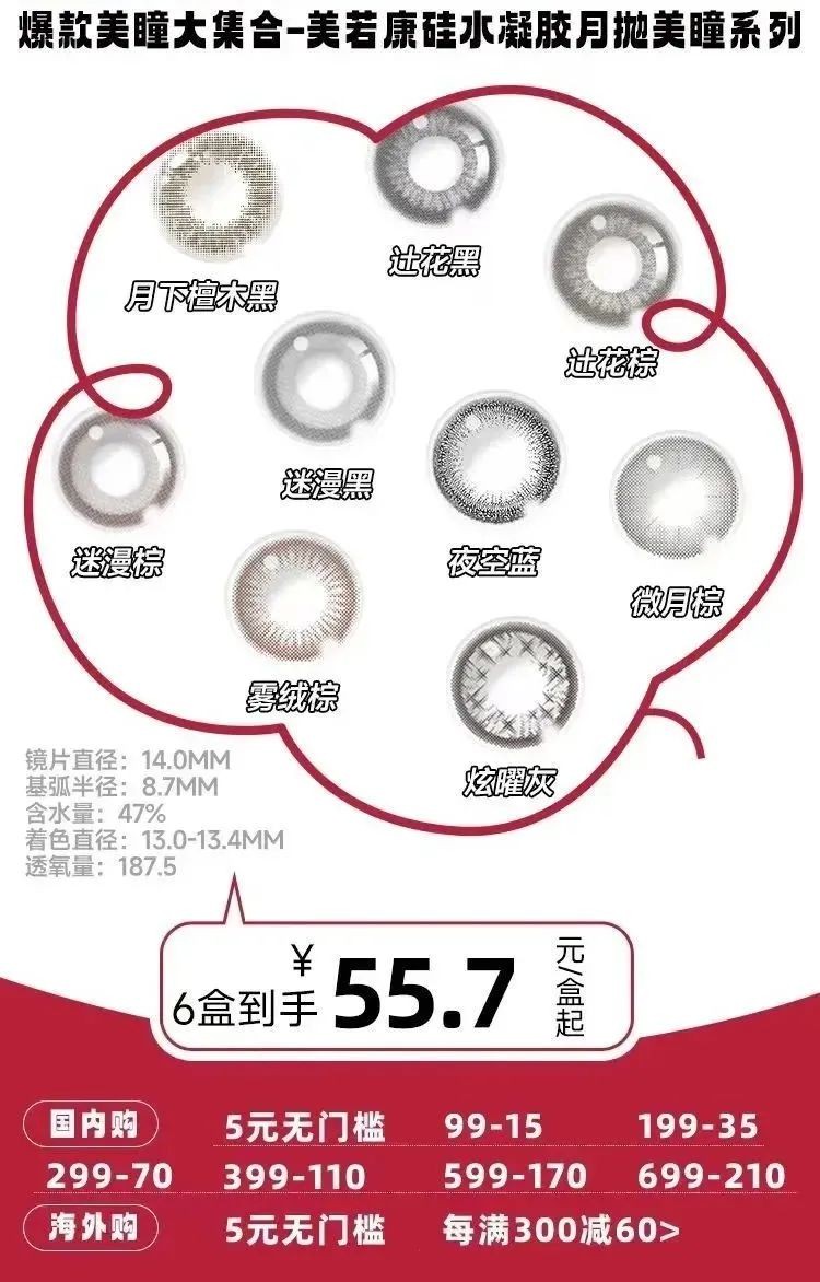 这次的6.18大促,视客眼镜网的价格极具诚意,正是为下半年囤货的绝佳时机!从5月20号到6月20号,“国内购”凡是下单即有5元无门槛抵用券,另有“99减15、199减35、299减70、399减110、599减170、699减210”的满减活动;"海淘购“”除了5元无门槛抵用券外,还享每满300就减60!热销款美瞳券后到手价更是低至40.3元/盒。