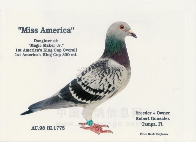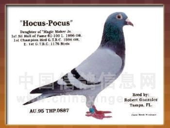 AU94THP1901“纯魔术师” 获得1995年美国荣光殿堂鸽王冠军 AU 95 THP 0887“戏法” 获得1996年美国荣光殿堂鸽王冠军 AU 98 HI 1775 “美国小姐” 获得全美皇冠杯最后一关冠军并获三关综合总冠军