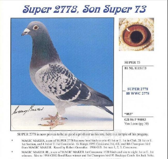 “2778出自‘超级73’和基础种雌‘083’,有关它及其后代可以写出一本书,正是他才把我们带到‘超级73’王朝的下一代及孙代。‘2778’和同父异母妹‘汽车132’做出一个儿子名叫‘魔术师’(即‘神奇制造者’),鲍比-冈塞利斯(亦即罗伯特·冈萨雷斯)把他作为基础种鸽,并且还拥有其他兄妹鸽。‘魔术师’的子代一共获得四十余次冠军。他的成绩好得令人难以置信,简直无话可说。”——引自2003年《赛鸽天地》第一期《凡龙家族的铭鸽——超级73》。