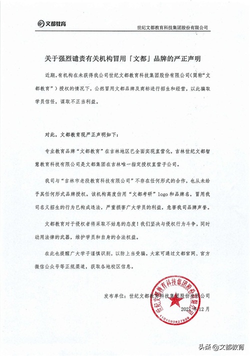 近期,文都教育发现,吉林地区有机构公然冒用我司品牌名称及logo开展线下招生,谎称自己是“文都教育”授权机构,有恃无恐地欺骗家长和学生。其侵权行为之露骨、态度之嚣张,简直是把法律和道义踩在脚下!