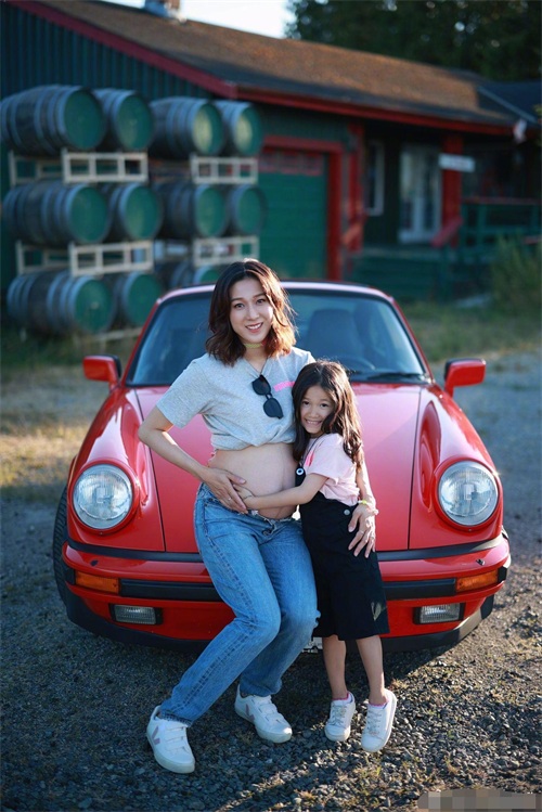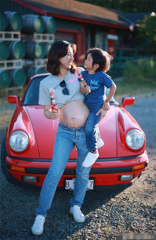 38岁钟嘉欣晒全家福!挺8个月孕肚单手抱娃,肚子上布满妊娠纹