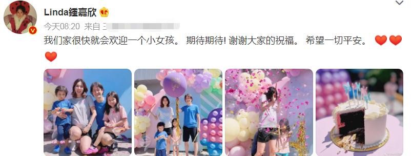 8月13日钟嘉欣晒出了派对现场的照片,还发文表示“我们家很快就会欢迎一个小女孩”,看得出来钟嘉欣十分期待三胎宝宝的到来。