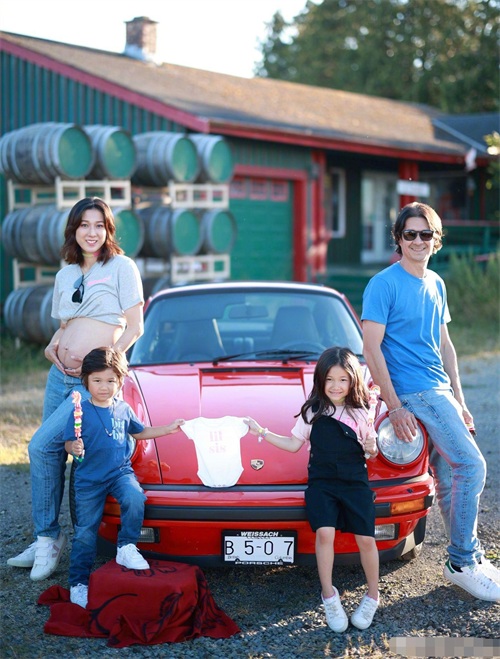 钟嘉欣还特地准备了一件婴儿服来代表肚子里的小宝宝,一双儿女站在车前举着婴儿服,钟嘉欣和老公则穿着儿女身后,画面十分温馨有爱。