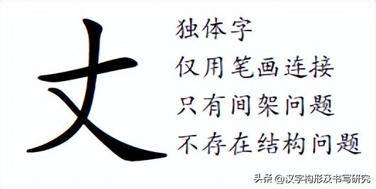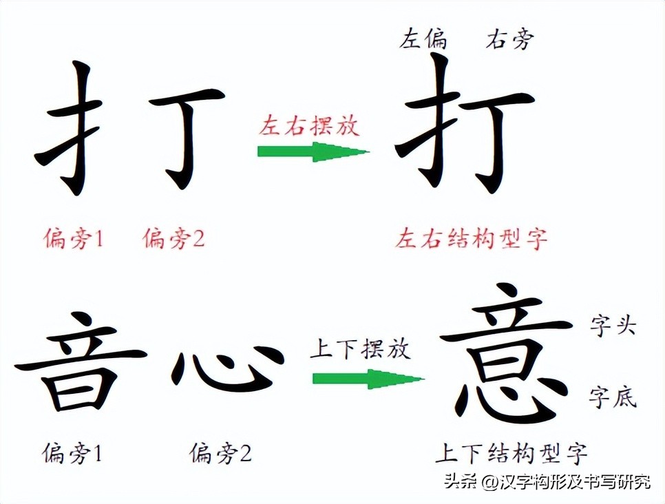 结构,则指偏旁在组成合体字时,偏旁摆放的方位以及相互之间的高低远近布局规律。如当两个偏旁一左一右摆放时,则称此字为左右结构型字;当三个偏旁左右右摆放时,则称此字为左中右结构型字;当两个偏旁一上一下摆放时,则称此字为上下结构型字(此时,又称这两个偏旁为字头、字底)等等,由此还产生了上中下、全包围、半包围结构型字。如果一个字只有一个偏旁独立构成时,则称其为独体结构型字。