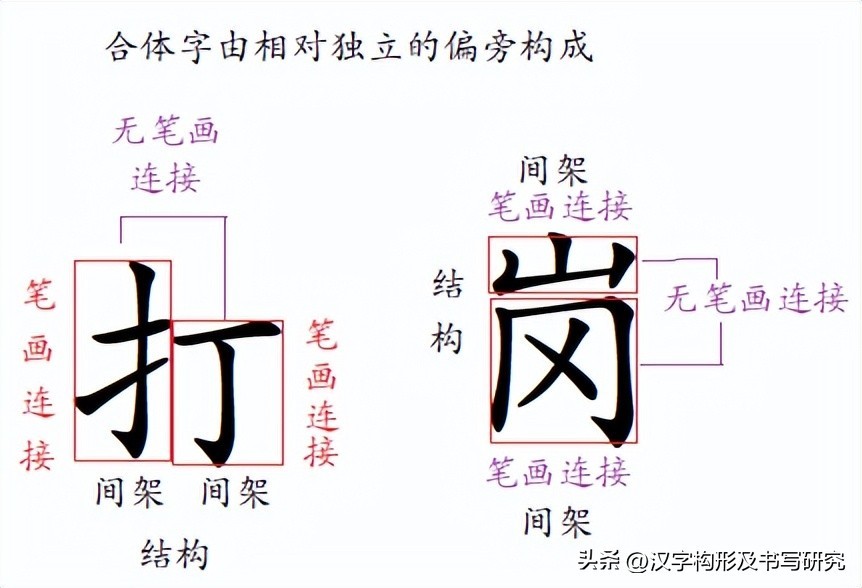 由此可知,偏旁既存在宽窄高低的大小,又有笔画相互联接;而偏旁在组成合体字时,偏旁之间相对独立,并不存在笔画连接。