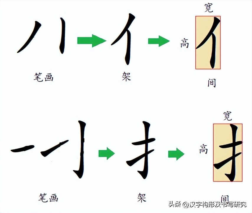 间架,则可从间与架两个方面来看待。间是指偏旁的宽窄大小,架则指构成偏旁的笔画排列组合的方法和规律。如单人旁、提手旁,都是由一些相应的笔画按一定的组合规律搭建了一幅架子,而这幅架子则有宽有高,其长宽面积占位大小则称作间。
