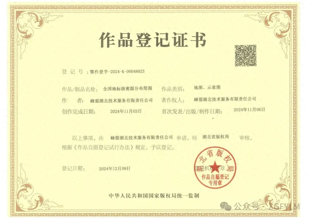 2024年12月9日,由蜂盟百位执行官历时八年寻山涉水、博引求证,CBFU旗下3000余家诚信蜂场助力中国好蜂蜜寻根溯源,齐力画出的《全国地标级蜜源植物简图》正式通过知识产权登记审核,获得具有版权效力的《作品登记证书》,成为融汇了《徐霞客游记》和《本草纲目》文化意义和应用价值的中国蜂产业珍贵作品。