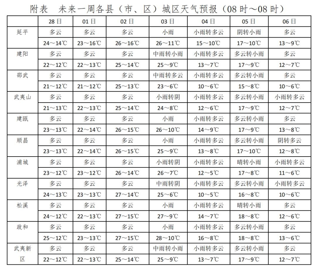 1.未来一周南平市多阴雨天气,请注意防范雨雾天气对交通的不利影响。