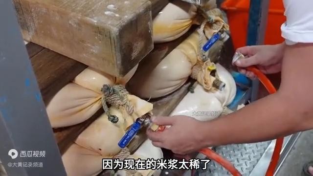 3. 接着利用抽水机将米浆全部抽进这种白色的袋子里,一层层堆叠起来。因为现在的米浆太稀了,必须使用千斤顶慢慢的施压,将里面的水分全部榨干,形成这样的块状。