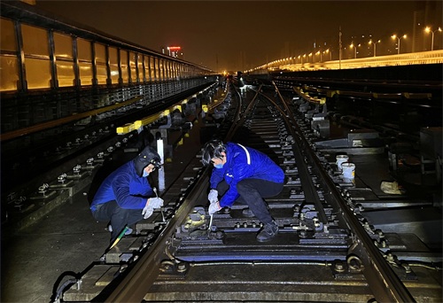 为应对新年首个寒潮雨雪,14日凌晨,5号线中医药大学站信号工班全员出动,重点维护高架区间设备。